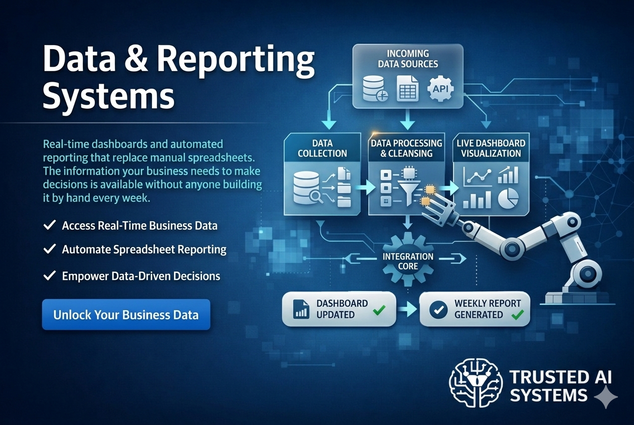 Real-time dashboards and automated reporting that replace manualspreadsheets. The information your business needs to make decisions is available without anyone building it byhand every week.
