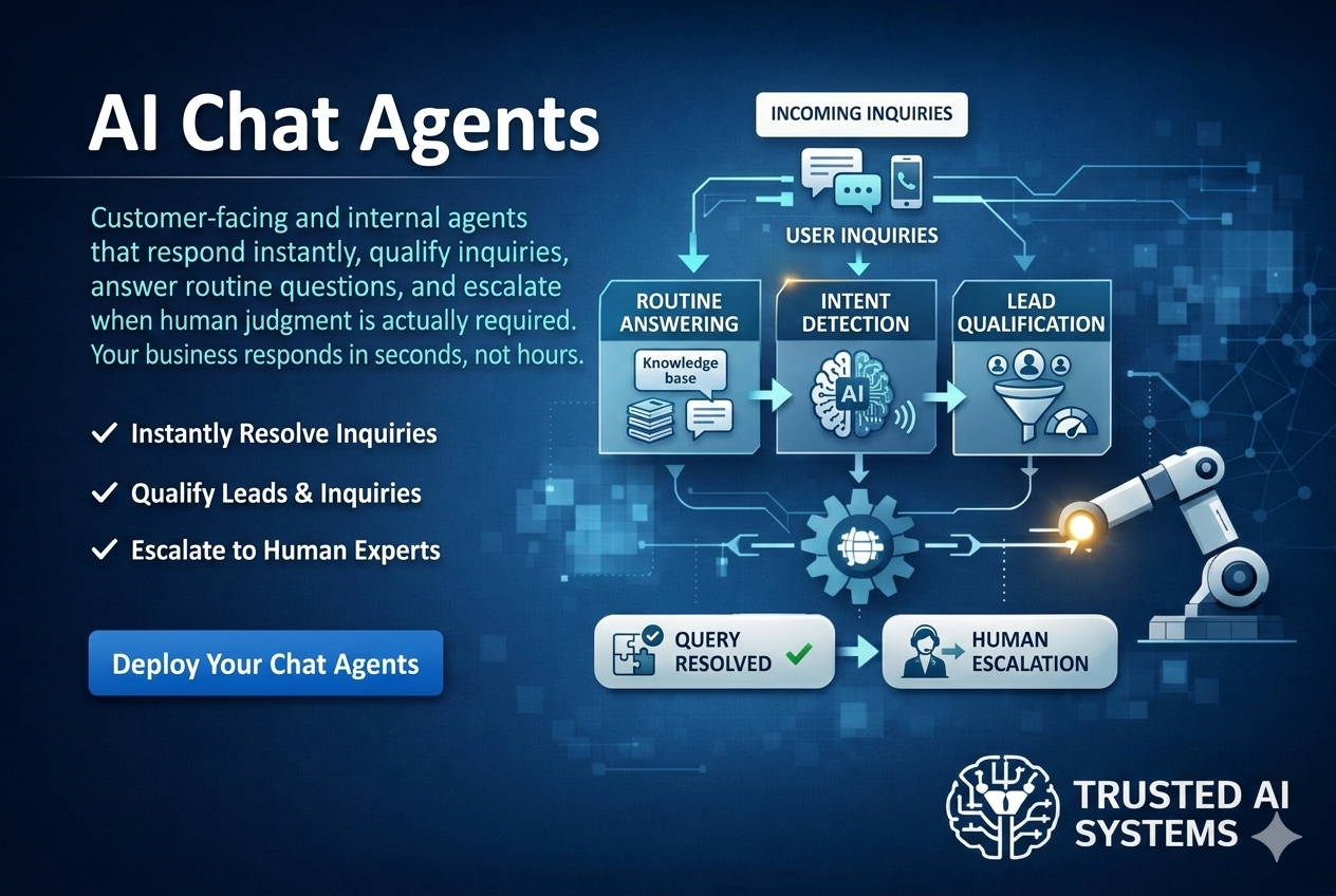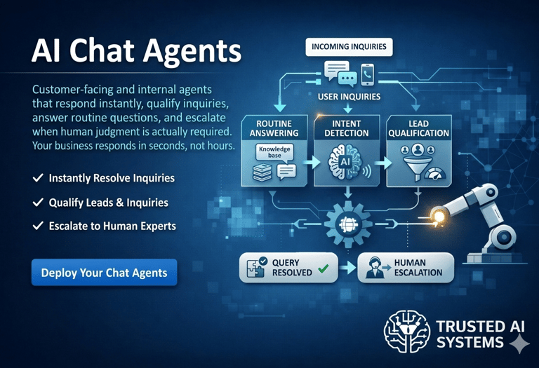 Customer-facing and internal agents that respond instantly, qualify inquiries, answerroutine questions, and escalate when human judgment is actually required. Your business responds in seconds,not hours.