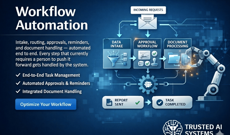 Intake, routing, approvals, reminders, and document handling — automated end to end. Every step that currently requires a person to push it forward gets handled by the system.