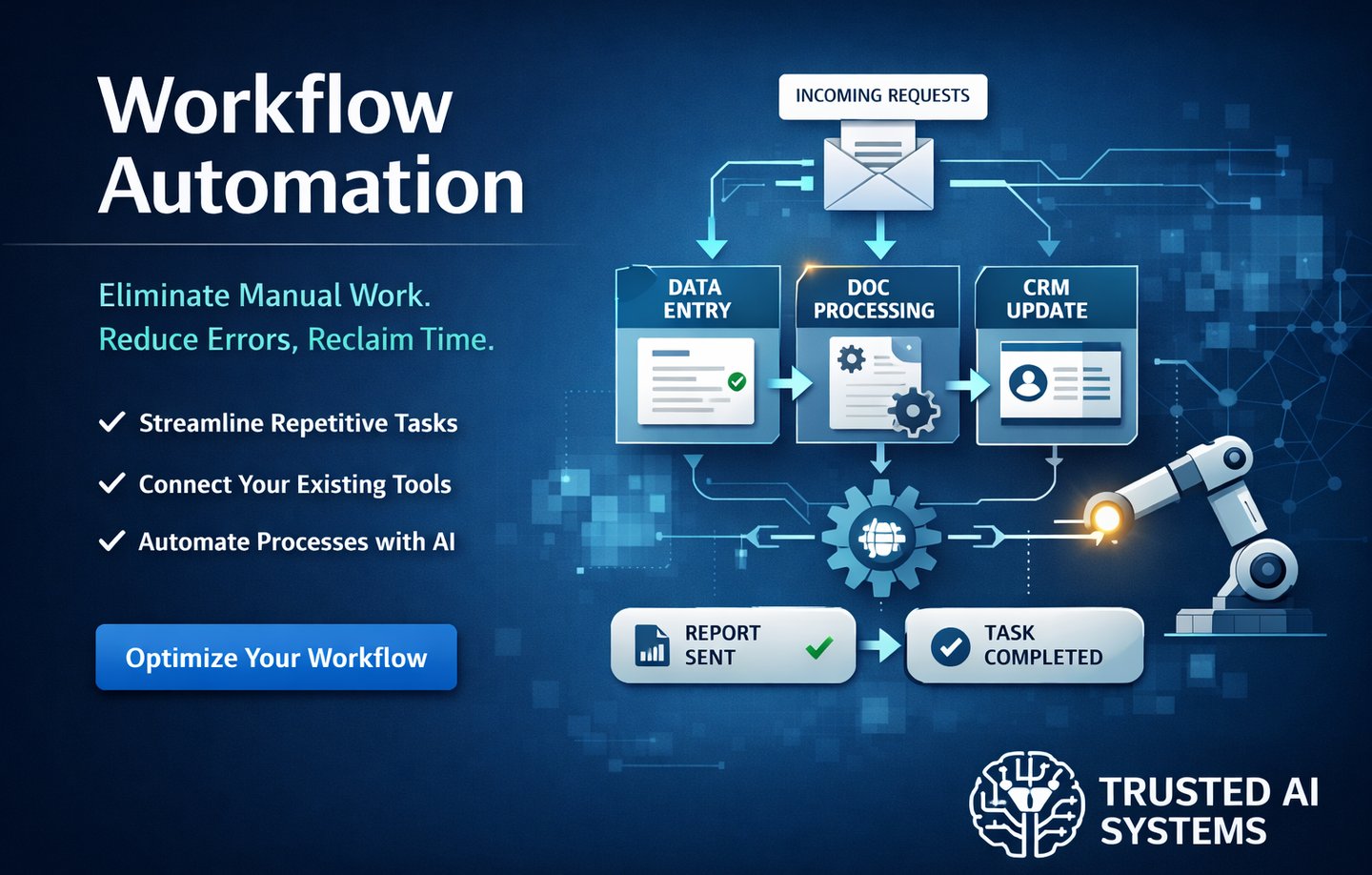 Workflow automation eliminates repetitive tasks, handoffs, and bottlenecks that slow down your business. We design AI-powered workflows that connect your existing tools and move work forward automatically.